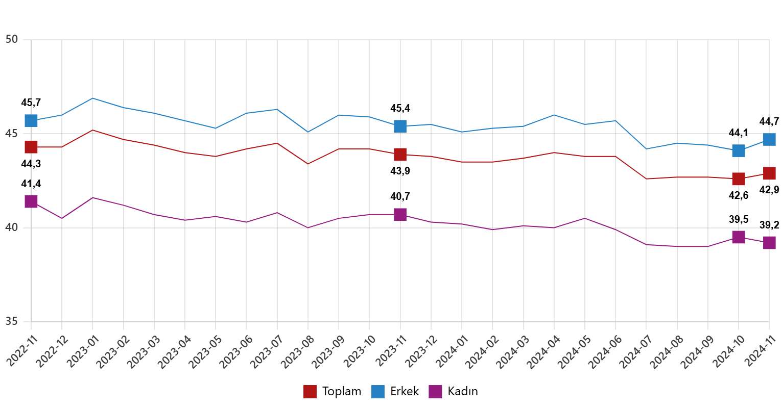 İstihdam edilenlerden referans döneminde işbaşında olanların, mevsim ve takvim etkilerinden arındırılmış haftalık ortalama fiili çalışma süresi 2024 yılı Kasım ayında bir önceki aya göre 0,3 saat artarak 42,9 saat olarak gerçekleşti.