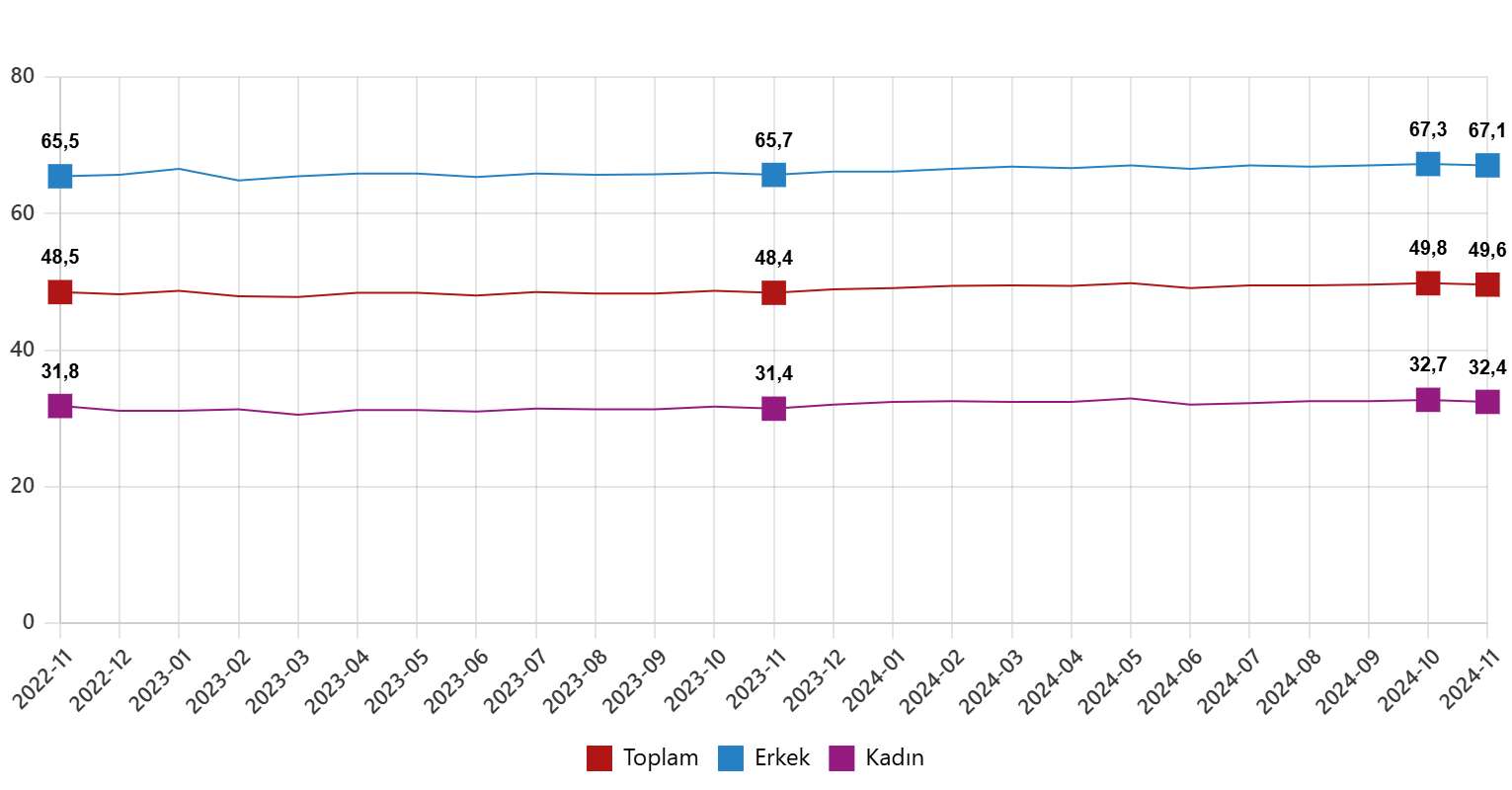 İşgücü 2024 yılı Kasım ayında bir önceki aya göre 252 bin kişi azalarak 35 milyon 820 bin kişi, işgücüne katılma oranı ise 0,4 puan azalarak %54,2 olarak gerçekleşti. İşgücüne katılma oranı erkeklerde %72,1 iken kadınlarda %36,7 oldu.