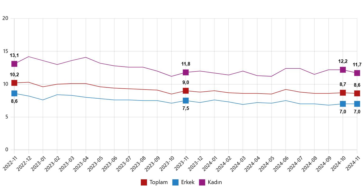 Hanehalkı İşgücü Araştırması sonuçlarına göre; 15 ve daha yukarı yaştaki kişilerde işsiz sayısı 2024 yılı Kasım ayında bir önceki aya göre 84 bin kişi azalarak 3 milyon 72 bin kişi oldu. İşsizlik oranı ise 0,1 puan azalarak %8,6 seviyesinde gerçekleşti. İşsizlik oranı erkeklerde %7,0 iken kadınlarda %11,7 olarak tahmin edildi.